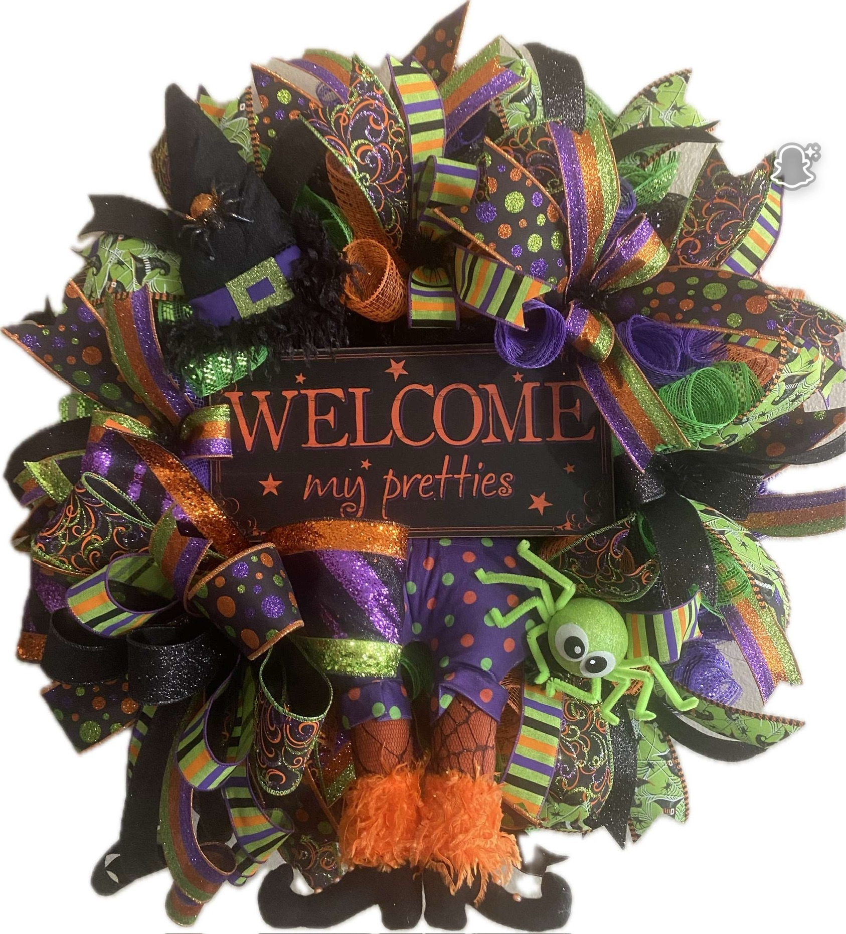 Make your doorway wickedly welcoming with our “Welcome My Pretties” Halloween wreath. Layered deco mesh and luxe wired ribbons in purple, lime, orange and black create a full, fluffy base that sparkles from the street. A sassy witch hat and legs peek out among the bows, while a friendly green spider and the “WELCOME my pretties” sign complete the playful look. It’s cheerful, over-the-top, and designed to last through the whole spooky season.